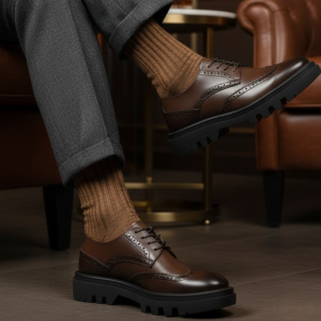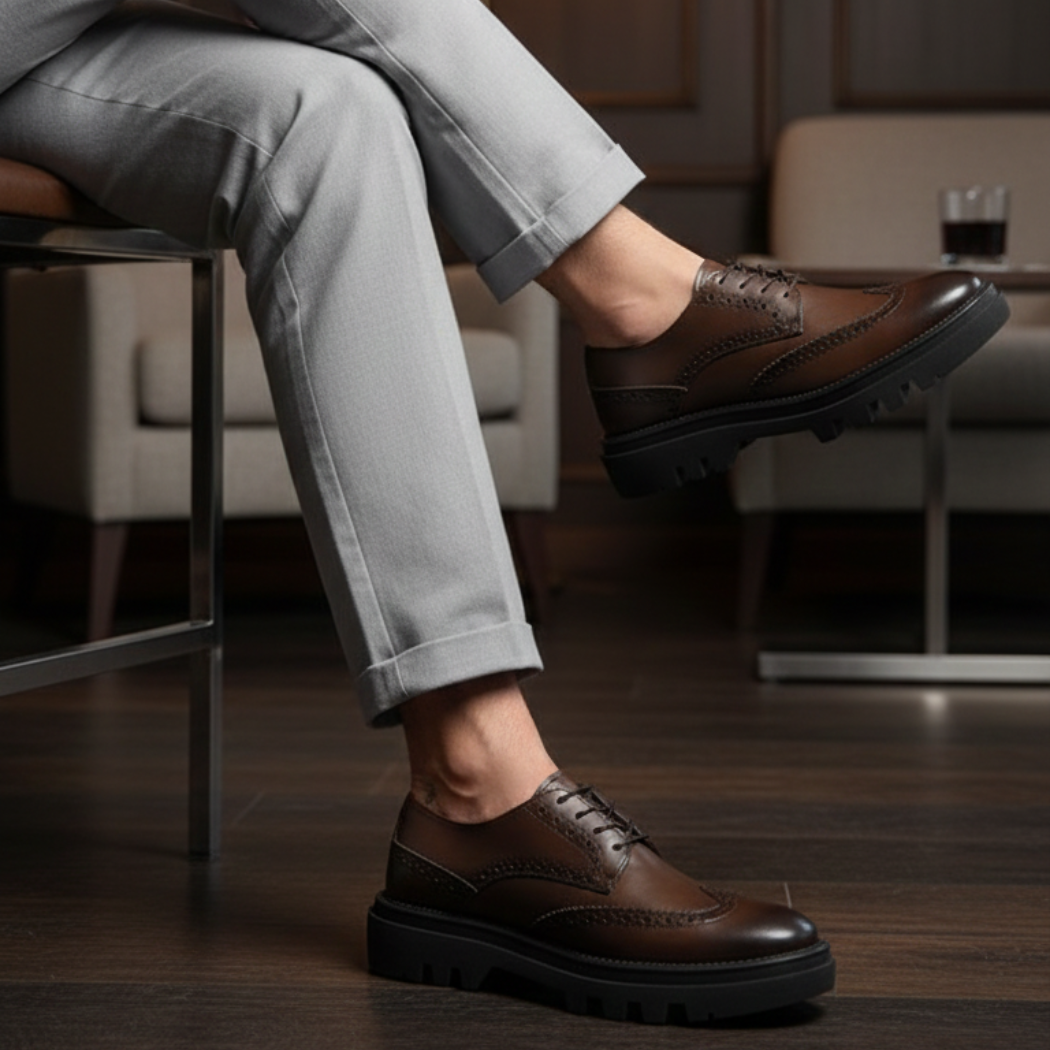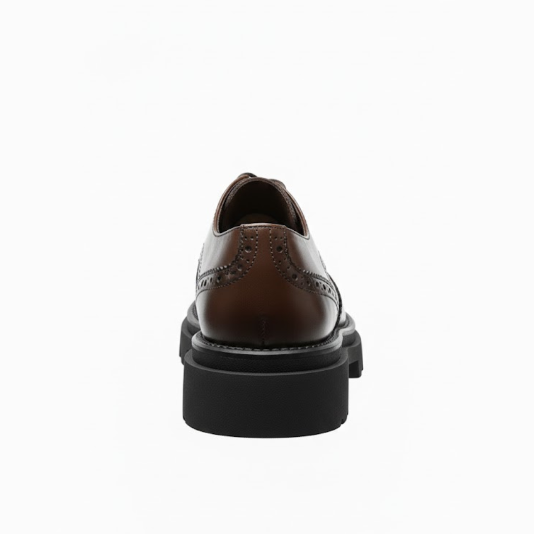 Es un zapato brogue de carácter clásico, reinterpretado para un uso contemporáneo. Su piel en tono café chocolate con efecto sombreado realza las perforaciones tradicionales del brogue, aportando profundidad, elegancia y presencia.