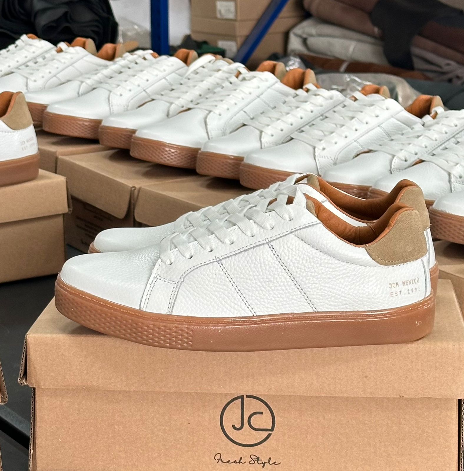 Tenis casual elaborado en piel genuina de grano fino, diseñado para el uso diario con una estética limpia y atemporal. Su silueta minimalista en color blanco se complementa con detalles en tono miel en el talón y una suela caramelo que aporta carácter, contraste y mayor durabilidad.