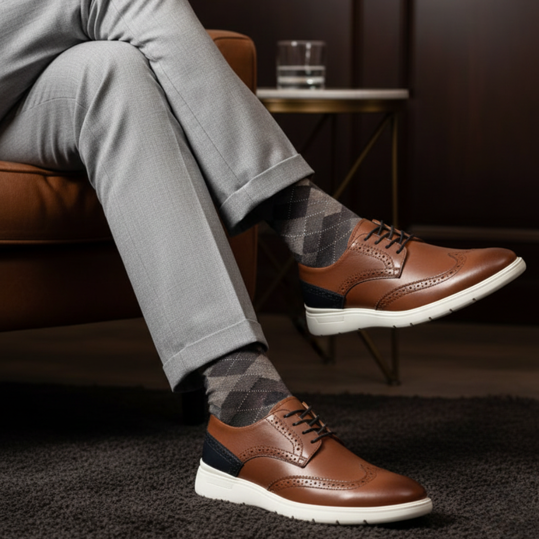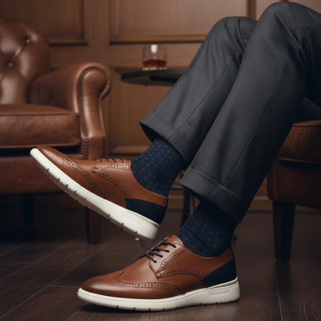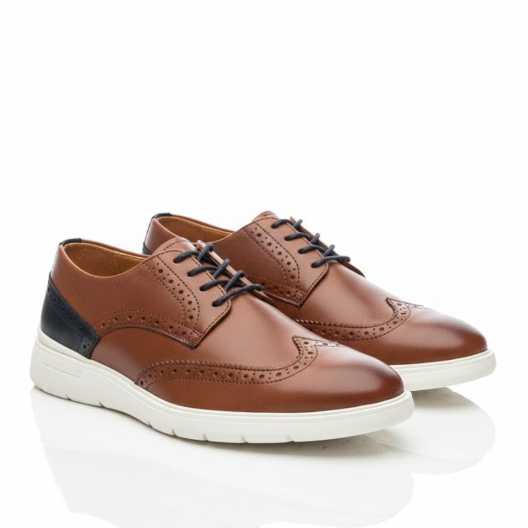 El acabado brogue clásico se integra con una suela ligera y cómoda, pensada para largas jornadas sin sacrificar presencia. El contraste canela con marino lo convierte en una opción perfecta tanto para la oficina como para eventos formales o looks smart casual.